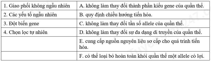 Ghép nội dung ở cột bên phải với nội dung ở cột bên trái để trở thành một câu có nội dung đúng về các nhân tố tiến hóa: