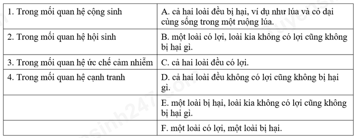 Ghép nội dung ở cột bên phải với nội dung ở cột bên trái để trở thành một câu có nội dung đúng về quan hệ giữa hai loài trong quần xã sinh vật: