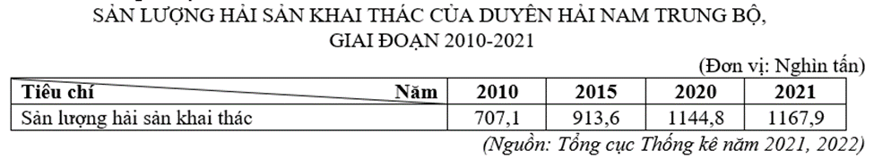 Căn cứ vào bảng số liệu trên, tính tốc độ tăng trưởng sản lượng hải sản khai thác của Duyên hải Nam Trung Bộ giai đoạn 2010 - 2021 (lấy năm 2010 = 100%), (làm tròn kết quả đến hàng đơn vị của %).