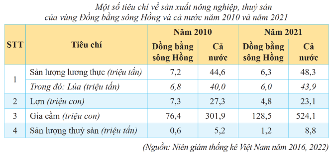 Dựa vào bảng số liệu trên, nhận xét nào không đúng với ngành nông nghiệp, thủy sản vùng Đồng bằng sông Hồng?