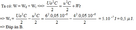 Một mạch dao động LC có điện trở thuần không đáng kể, tụ điện có điện dung 0,05μF. Dao động điện từ riêng (tự do) của mạch LC với hiệu điện thế cực đại ở hai đầu tụ điện bằng 6V. Khi hiệu điện thế ở hai đầu tụ điện là 4V thì năng lượng từ trường trong mạch bằng