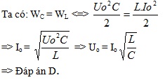 Một mạch dao động gồm có cuộn dây L thuần điện cảm và tụ điện C thuần dung kháng. Nếu gọi I0 dòng điện cực đại trong mạch, hiệu điện thế cực đại U0 giữa hai đầu tụ điện liên hệ với I0 như thế nào ? Hãy chọn kết quả đúng trong những kết quả sau đây: