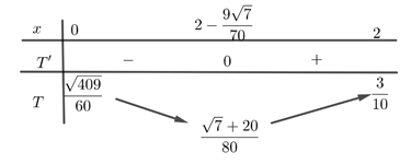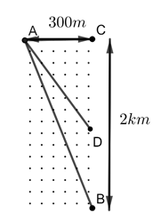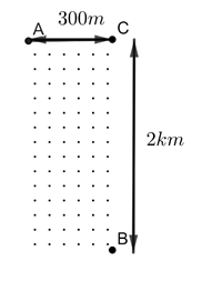 Một người đàn ông đang ở vị trí điểm \(A\) trên bờ một đoạn sông thẳng, rộng \(300m\) và muốn đến điểm \(B\)ở bờ đối diện xuôi về phía hạ lưu \(2km\) ( xem hình vẽ). Biết người này có một chiếc thuyền, với vận tốc trung bình khi chèo thuyền trên đoạn sông này là \(6km/h\). Nhưng nếu có thể lên bờ và chạy bộ thì vận tốc trung bình mà anh ta có thể đạt được là \(8km/h\). Hãy tính thời gian nhanh nhất mà anh ta có thể đạt được để di chuyển từ \(A\) đến \(B\), theo đơn vị phút. Làm tròn kết quả đến hàng đơn vị.
