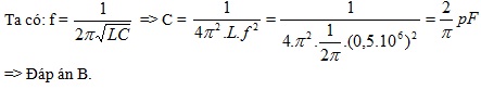 Một mạch dao động LC gồm cuộn dây thuần cảm có độ tự cảm L = 1/2π H và một tụ điện có điện dung C. Tần số dao động riêng của mạch là 0,5MHz. Giá trị của điện dung là