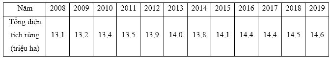 Cho biết tổng diện tích rừng từ năm 2008 đến năm 2019 ở nước ta. (Nguồn: