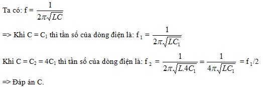 Một mạch dao động điện từ LC gồm cuộn dây thuần cảm có độ tự cảm không đổi và tụ điện có điện dung thay đổi được. Điện trở của dây dẫn không đáng kể và trong mạch có dao động điện từ riêng. Khi điện dung có giá trị C1 thì tần số dao động riêng của mạch là f1. Khi điện dung có giá trị C2 = 4C1 thì tần số dao động điện từ riêng trong mạch là