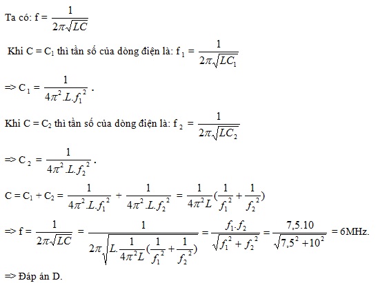 Một mạch dao động LC lí tưởng gồm cuộn cảm thuần có độ tự cảm không đổi, tụ điện có điện dung C thay đổi. Khi C = C1 thì tần số dao động riêng của mạch là 7,5 MHz và khi C = C2 thì tần số dao động riêng của mạch là 10 MHz. Nếu C = C1 + C2 thì tần số dao động riêng của mạch là