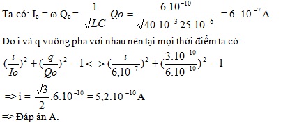 Một mạch dao động LC lí tưởng có L = 40mH, C = 25µF, điện tích cực đại của tụ q0 = 6.10-10C. Khi điện tích của tụ bằng 3.10-10C thì dòng điện trong mạch có độ lớn.