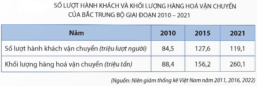 Dựa vào bảng số liệu trên, để thể hiện số lượt hành khách và khối lượng hàng hóa vận chuyển của Bắc Trung Bộ giia đoạn 2010 – 2021, biểu đồ nào là thích hợp nhất?
