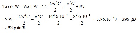 F và cuộn cảm thuần. Biết giá trị cực đại của điện áp giữa hai đầu tụ điện là Uo = 14V. Tại thời điểm điện áp giữa hai bản của tụ là u = 8V năng lượng từ trường trong mạch bằng: