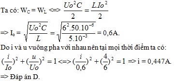 Một mạch dao động gồm tụ điện có điện dung C = 50μF và cuộn dây có độ tự cảm L = 5mH. Điện áp cực đại trên tụ điện là 6V. Cường độ dòng điện trong mạch tại thời điểm điện áp trên tụ điện bằng 4V là:
