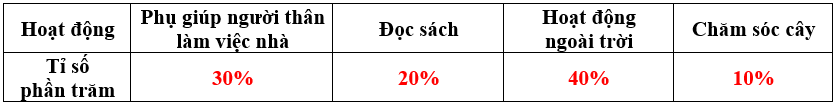 Học sinh lớp 5C đã tham gia cuộc khảo sát về hoạt động yêu thích nhất trong ngày cuối tuần. Kết quả được thể hiện như sau: