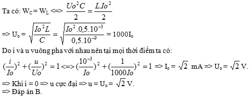 Một mạch dao động điện từ, cuộn dây thuần cảm có hệ số tự cảm 0,5mH, tụ điện có điện dung 0,5nF. Trong mạch có dao động điện từ điều hòa.Khi cường độ dòng điện trong mạch là 1mA thì điện áp hai đầu tụ điện là 1V. Khi cường độ dòng điện trong mạch là 0 A thì điện áp hai đầu tụ là: