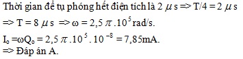 Tại thời điểm ban đầu, điện tích trên tụ điện của mạch dao động LC có gía trị cực đại q0 = 10-8C. Thời gian để tụ phóng hết điện tích là 2μs. Cường độ cực đại trong mạch là: