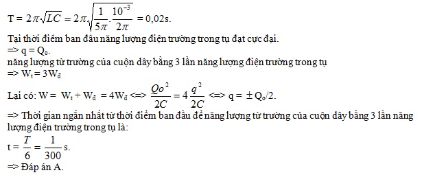 F được nạp một lượng điện tích nhất định. Sau đó nối 2 bản tụ vào 2 đầu 1 cuộn dây thuần cảm có độ tự cảm L =