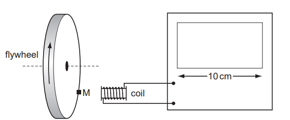 Sơ đồ cho thấy máy dao động ký điện tử (c.r.o) được sử dụng để đo tốc độ quay của bánh đà. Bánh đà có một nam châm nhỏ M gắn trên đó. Mỗi lần nam châm đi qua vị trí cuộn dây, một xung điện áp được tạo ra, được truyền đến dao động ký. Màn hình hiển thị của dao động ký rộng 10 cm. Bánh đà đang quay với tốc độ khoảng 3000 vòng/phút.