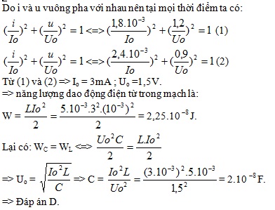 Dao động điện từ trong mạch là dao động điều hoà. Khi hiệu điện thế giữa hai đầu cuộn cảm bàng 1,2V thì cường độ dòng điện trong mạch bằng 1,8mA.Còn khi hiệu điện thế giữa hai đầu cuộn cảm bằng 0,9V thì cường độ dòng điện trong mạch bằng 2,4mA. Biết độ tự cảm của cuộn dây L = 5mH. Điện dung của tụ và năng lượng dao động điện từ trong mạch bằng: