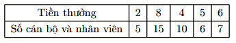 Tiền thưởng (triệu đồng) cho cán bộ và nhân viên trong một công ty cho bởi bảng phân bố tần số sau