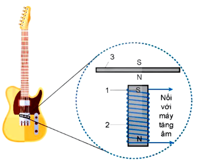 | d) Khi hoạt động dao động của dây đàn (3) tạo ra dòng điện cảm ứng trong cuộn dây (2) có cường độ và chiều phù hợp rồi được dẫn tới máy tăng âm. |