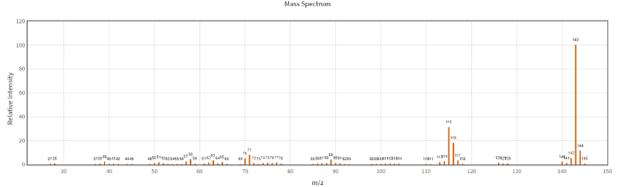 β-naphthylamine là môt arylamine có nguồn gốc từ napthalene. Đây là tiền thân của nhiều loại thuốc nhuộm trong đó điển hình thuốc nhuộm azo. Đồng thời β-naphthylamine là một trong những nguyên nhân gây lên ung thư bàng quang (ung thư biểu mô tế bào chuyển tiếp). Khi phân tích β-naphthaylamine trên phổ MS được kết quả như hình dưới. Peak ion M+ có giá trị bằng