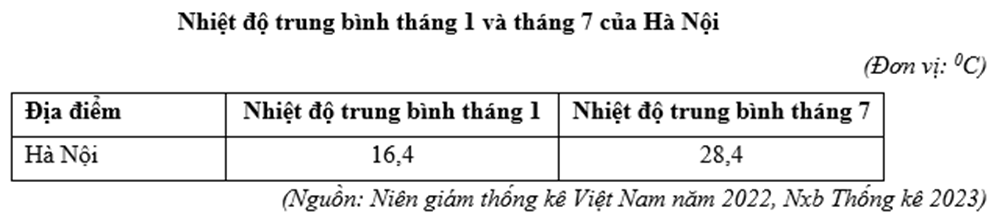 Căn cứ vào bảng số liệu trên, hãy cho biết biên độ nhiệt của Hà Nội là bao nhiêu 0C (làm tròn kết quả đến một chữ số thập phân).