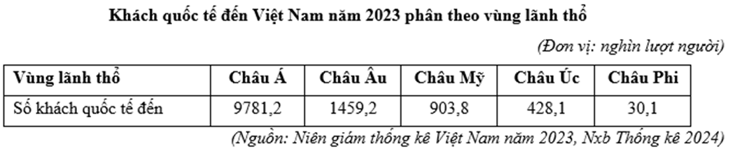 Căn cứ vào bảng số liệu, cho biết tỉ trọng khách du lịch châu Á đến nước ta năm 2023 so với tổng số khách quốc tế chiếm bao nhiêu phần trăm (làm tròn kết quả đến một chữ số thập phân).