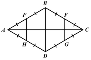 Cho hình thoi \(ABCD\) có \(\angle A = {60^0}.\) Gọi \(E,\,F,\,G,\,H\) lần lượt là trung điểm của các cạnh \(AB,\,BC,\,CD,\,DA.\) Chứng minh rằng đa giác \(EBFGDH\) là đa giác đều.