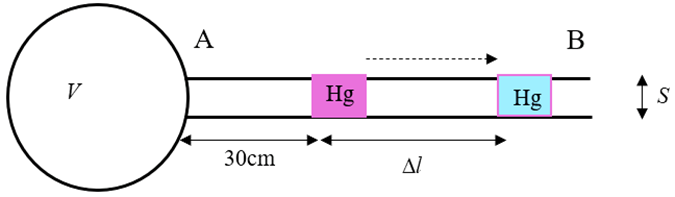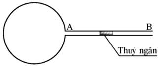 Một mô hình áp kế khí ở hình bên gồm một bình cầu thuỷ tinh có thể tích \(270c{m^3}\)gắn với một ống nhỏ AB nằm ngang có tiết diện \(0,1c{m^2}\). Trong ống có một giọt thuỷ ngân. Ở \({0^0}C\)giọt thuỷ ngân cách A 30 cm . Sau đó người ta hơ nóng bình cầu để giọt thủy ngân dịch chuyển đến vị trí mới. Coi thể tích bình là không đổi, ống AB đủ dài để giọt thủy ngân không chảy ra ngoài, khí trong bình là khí lí tưởng.
