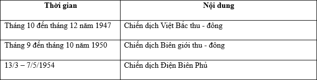 | b) Điểm chung của ba chiến dịch trên là đều nhận được sự viện trợ từ các nước Liên Xô và Trung Quốc. | ||