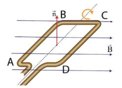 Để tạo ra dòng điện xoay chiều, người ta cho một khung dây dẫn phẳng ABCD gồm 50 vòng dây, mỗi vòng dây có diện tích \(S = 100\;{\rm{c}}{{\rm{m}}^2}\), quay đều với tốc độ \(\dfrac{{3000}}{\pi }\) vòng/phút quanh một trục vuông góc với các đường sức của một từ trường đều có cảm ứng từ \({\rm{B}} = 0,2\;{\rm{T}}\) như hình bên.