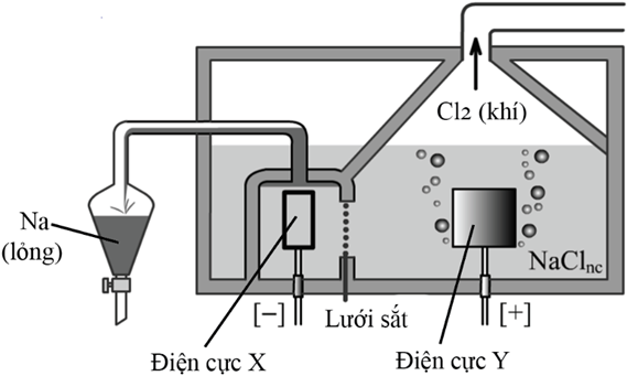 Sodium được sản xuất trong công nghiệp bằng cách điện phân muối ăn ở trạng thái nóng chảy như hình dưới. Biết rằng trong hai điện cực sử dụng chế tạo bình điện phân, một điện cực làm từ sắt, một điện cực làm từ grafite (than chì).