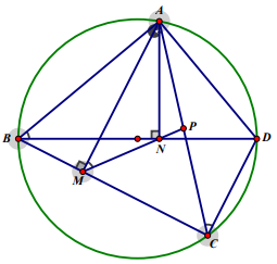 Trong mặt phẳng tọa độ \(O x y\), cho tứ giác \(A B C D\) nội tiếp đường tròn đường kính \(B D\). Gọi \(M\) , \(N\) lần lượt là hình chiếu vuông góc của \(A\) lên \(B C\) và \(B D\); gọi \(P\) là giao điểm của \(M N\) và \(A C\). Biết đường thẳng \(A C\) có phương trình \(x-y-1=0, M(0 ; 4), N(2 ; 2)\) và hoành độ điểm \(A\) nhỏ hơn 2.