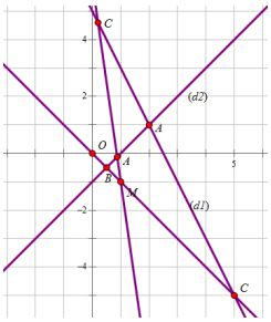 Trong mặt phẳng tọa độ \(O x y\), cho điểm \(M(1 ;-1)\) và hai đường thẳng có phương trình \(\left(d_1\right): x-y-1=0,\left(d_2\right): 2 x+y-5=0\). Gọi \(A\) là giao điểm của hai đường thẳng trên. Biết rằng có hai đường thẳng \((d)\) đi qua \(M\) cắt hai đường thẳng trên lần lượt tại hai điểm \(B, C\) sao cho \(A B C\) là tam giác có \(B C=3 A B\) có dạng: \(a x+y+b=0\) và \(c x+y+d=0\), giá trị của \(T=a+b+c+d\) là
