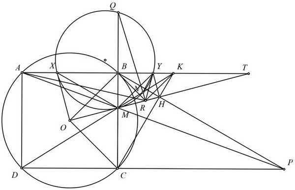3) Các đường thẳng vuông góc với \(OH\) kẻ từ \(O\) và \(H\), cắt đường thẳng \(AB\) lần lượt tại \(X,Y\). Lấy \(Q\) thuộc tia đối của tia \(BC\) sao cho \(BQ = CM\). Chứng minh hai đường thẳng \(QR,DK\) cắt nhau tại một điểm thuộc đường tròn ngoại tiếp tam giác \(MXY\)