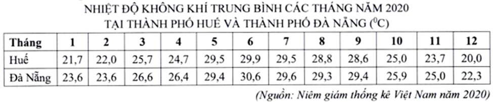 Cho bảng số liệu:Dựa vào bảng số liệu, hãy cho biết trong năm 2020 thành phố nào có biên độ