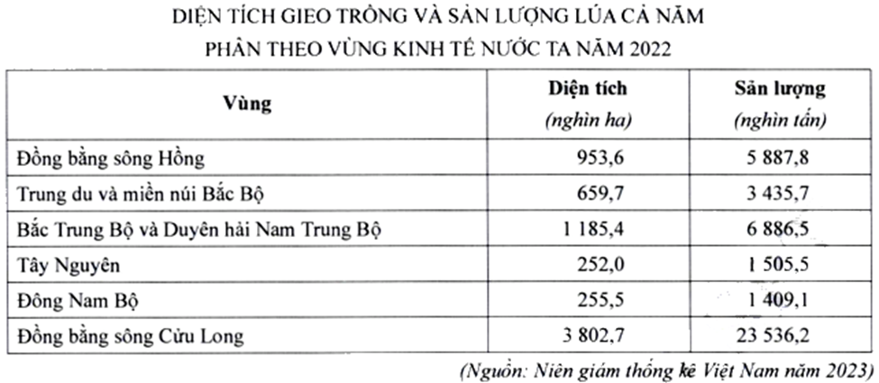 Cho bảng số liệu:Dựa vào bảng số liệu, hãy cho biết trong năm 2022 vùng nào ở nước ta có