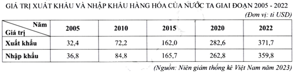 Cho bảng số liệu:Dựa vào bảng số liệu, cho biết trị giá nhập siêu lớn
