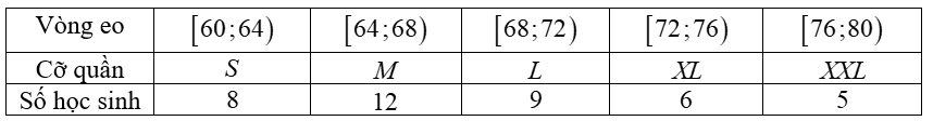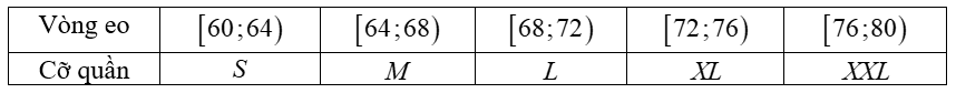 Công ty \(X\)trúng thầu may đồng phục cho học sinh trường \(Y\) và họ đã đưa ra cỡ quần tây dựa vào số đo vòng eo của học sinh nam như sau: