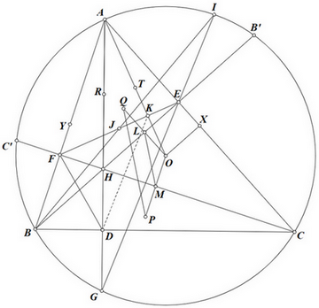 Cho tam giác nhọn \(ABC\) có \(AB < BC < CA\), nội tiếp đường tròn \(\left( O \right)\). Các đường cao \(AD,BE\) và \(CF\) của tam giác \(ABC\) cắt nhau tại \(H\). Tia \(AD\) cắt đường tròn \(\left( O \right)\) tại điểm \(G\), tia \(GE\) cắt đường tròn \(\left( O \right)\) tại điểm \(I\) (\(G\) khác \(A\) và \(I\) khác \(G\)). Gọi \(J\) là giao điểm của \(BI\) và \(EF,K\) là giao điểm của \(OA\) và \(EF\).