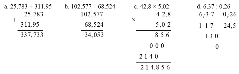 Đặt tính rồi tínha. 25,783 + 311,95b. 102,577 – 68,524c. 42,8 × 5,02d. 6,37 :