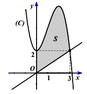 Cho hàm số \(f(x) = - {x^3} + 3{x^2} + 2\) có đồ thị \((C)\) như hình vẽ. Tính diện tích \(S\)