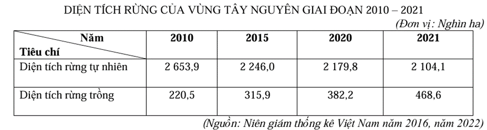 Căn cứ vào bảng số liệu, tính tổng diện tích rừng của vùng Tây Nguyên năm 2021. (Làm tròn kết quả đến hàng đơn vị của nghìn ha)