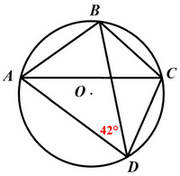 Cho tứ giác \(ABCD\) nội tiếp một đường tròn. Biết \(\angle {ADB} = {42^0}\). Tìm số đo \(\angle {BCA}\)