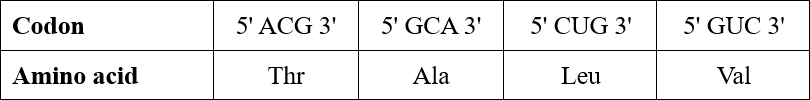 Cho biết các bộ ba trên mRNA mã hóa cho các amino acid tương ứng như sau: