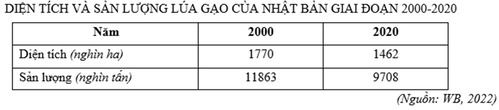 Căn cứ vào bảng số liệu trên, tính năng suất lúa của Nhật Bản năm 2020? (làm tròn kết quả đến số thập phân thứ nhất của tạ/ha)