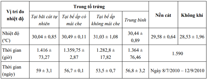 Bảng 1 trình bày nghiên cứu về nhiệt độ ấp trứng của các ổ thí nghiệm trên bãi cát tự nhiên, trên bể ấp cùng với nhiệt độ không khí và nhiệt độ nền cát