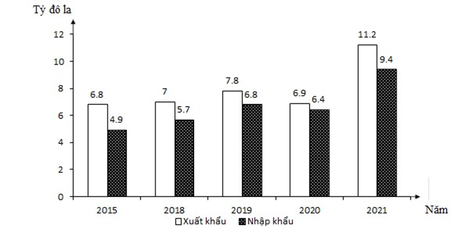 Cho biểu đồ về xuất khẩu, nhập khẩu của Bru-nây giai đoạn 2015 - 2021 (Số liệu theo
