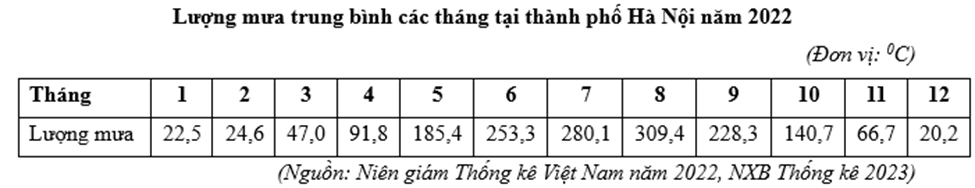 Căn cứ vào bảng số liệu trên, hãy cho biết tổng lượng mưa năm 2022 của thành phố Hà Nội là bao nhiêu mm? (làm tròn kết quả đến hàng đơn vị).