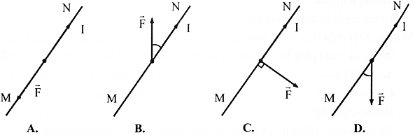 Trong các hình vẽ sau đây, MN là đoạn dây dẫn mang dòng điện I đặt trong từ trường, véc tơ \(\vec F\) và đoạn dây MN đều nằm trong mặt phẳng hình vẽ. Véc tơ \(\vec F\) trong hình nào sau đây có thể dùng để biểu diễn lực từ tác dụng lên đoạn MN?
