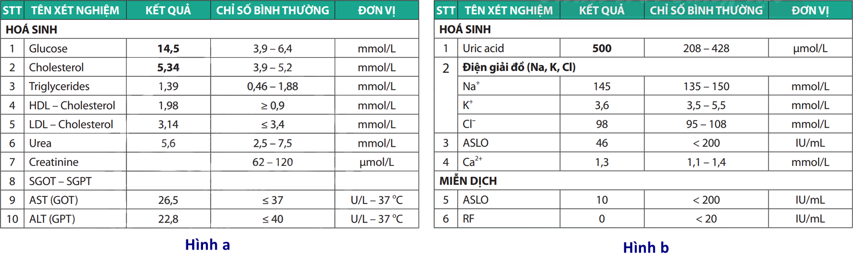 Một bệnh nhân tiểu đường và một bệnh nhân Gout có kết quả xét nghiệm máu như phiếu a, b